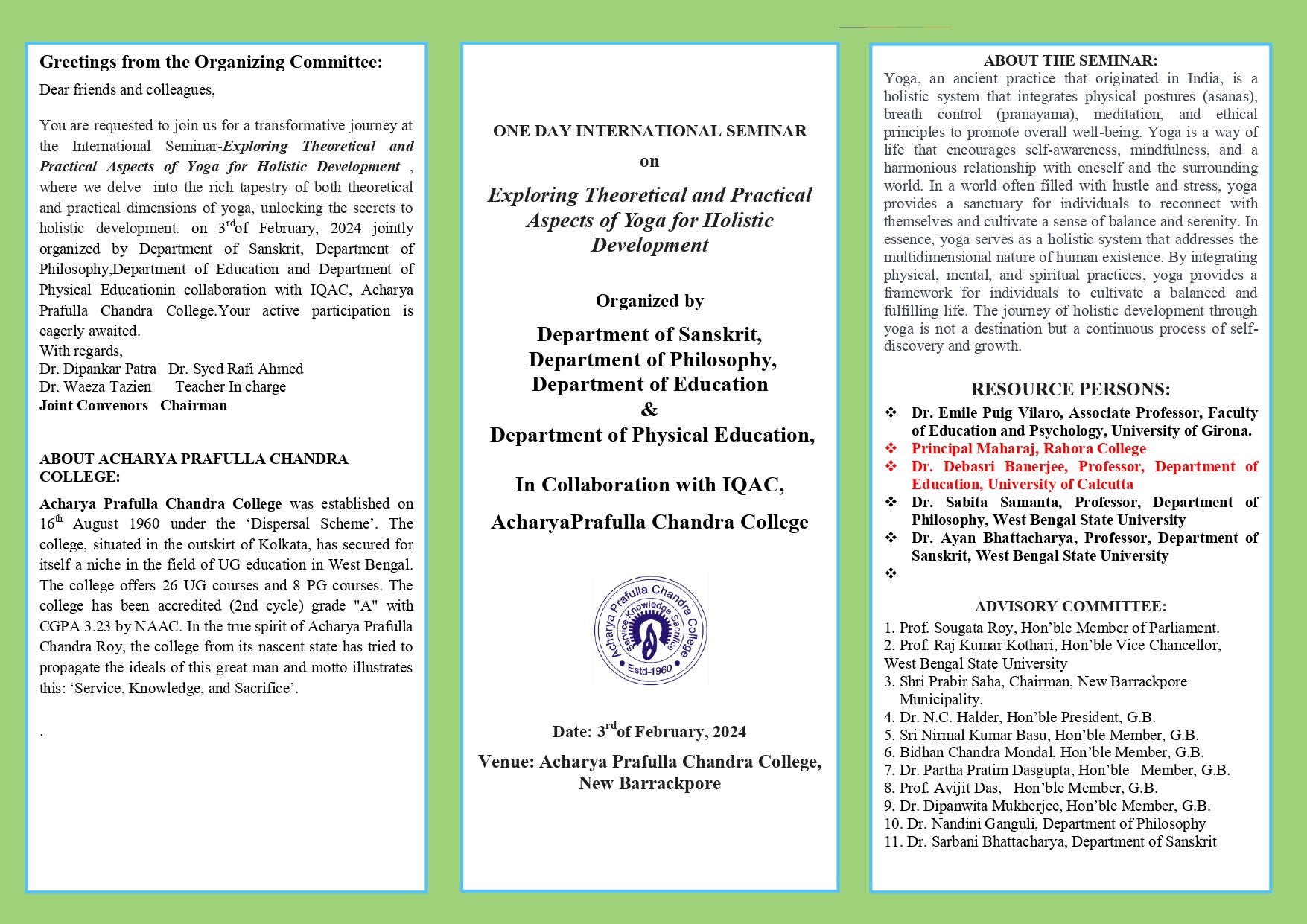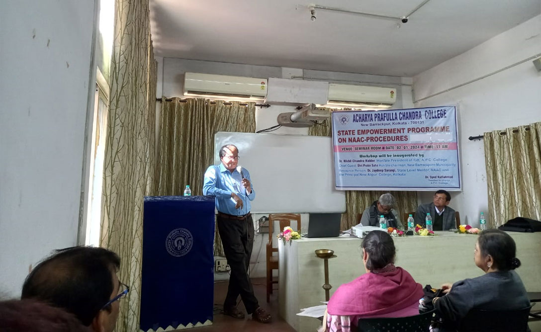 Acharya Prafulla Chandra College was founded on 16 August, 1960 under the Dispersal Scheme-with the joint participation of the State and Central Governments. Late Haripada Biswas was the founder secretary of this college. Initially it was named 'New Barrackpore College'. Acharya Prafulla Chandra Roy, after whom the college has its present name, was a great educationist with a vision. It was he who wanted universal literacy; he spoke of 'basic education' and 'utility education'; he advocated the concept of empowerment of women; he wanted the development of indigenous industries through cultivation of entrepreneurial acumen of the educated youth. In the true spirit of Acharya Prafulla Chandra Roy, the college from its nascent state, has tried to propagate the ideals of this great man and the motto illustrates this; "Service, Knowledge, Sacrifice".